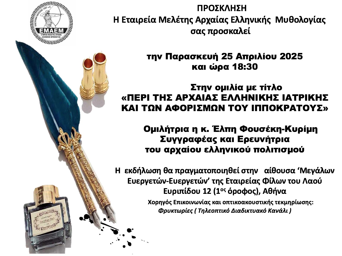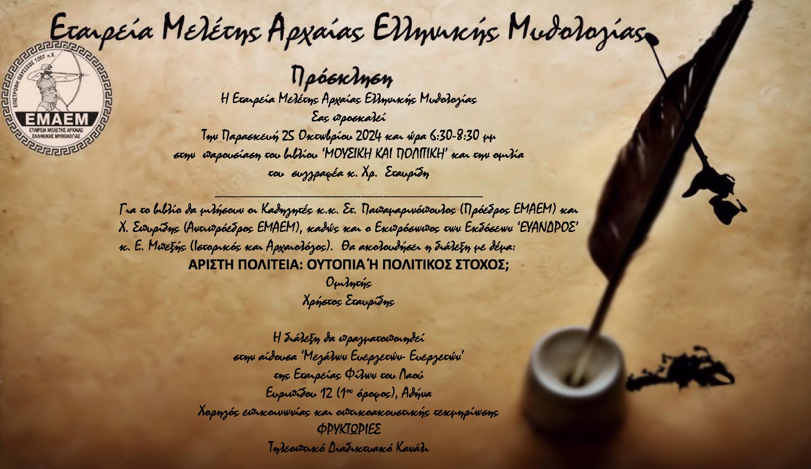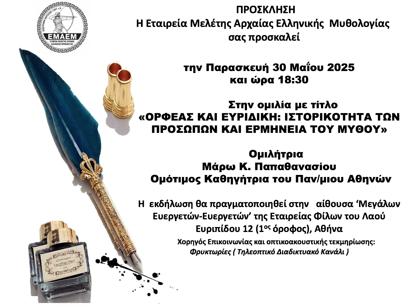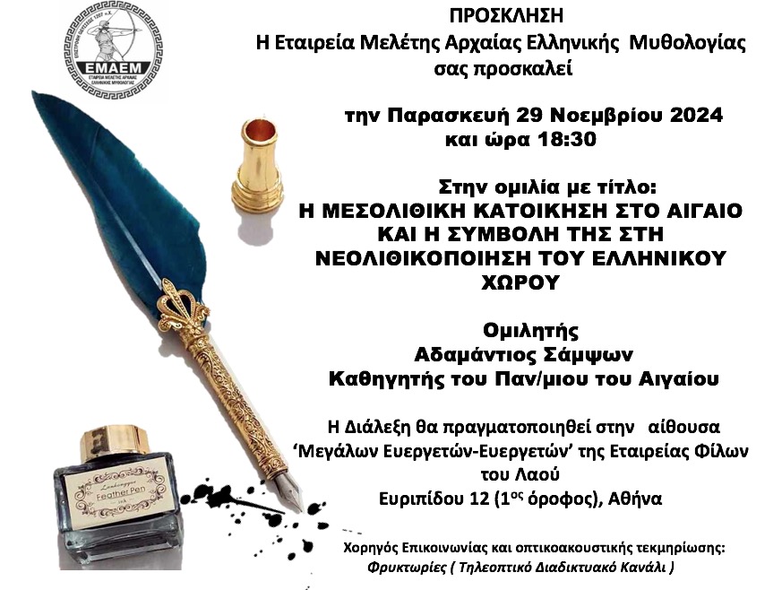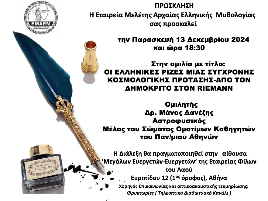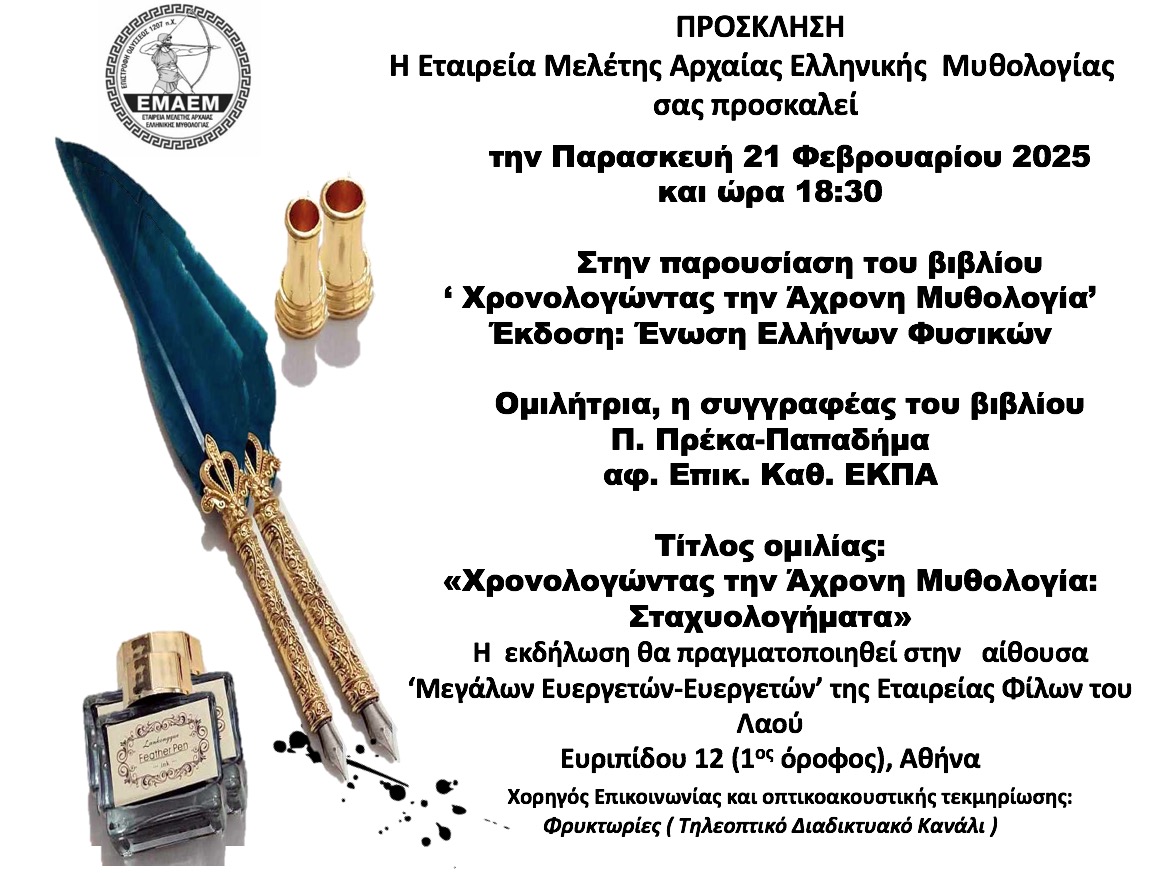 Στα πλαίσια των διαλέξεων της ΕΜΑΕΜ, θα παρουσιαστεί το βιβλίο με τίτλο: «Χρονολογώντας την Άχρονη Μυθολογία» της Π. Πρέκα-Παπαδήμα.